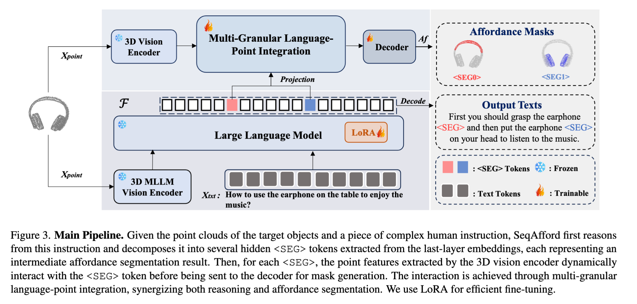 segmentation tokens output by the 3D MMLLM into the multi-granularity language-point cloud combination module to complete 3D dense predictionSupport sequential instruction execution