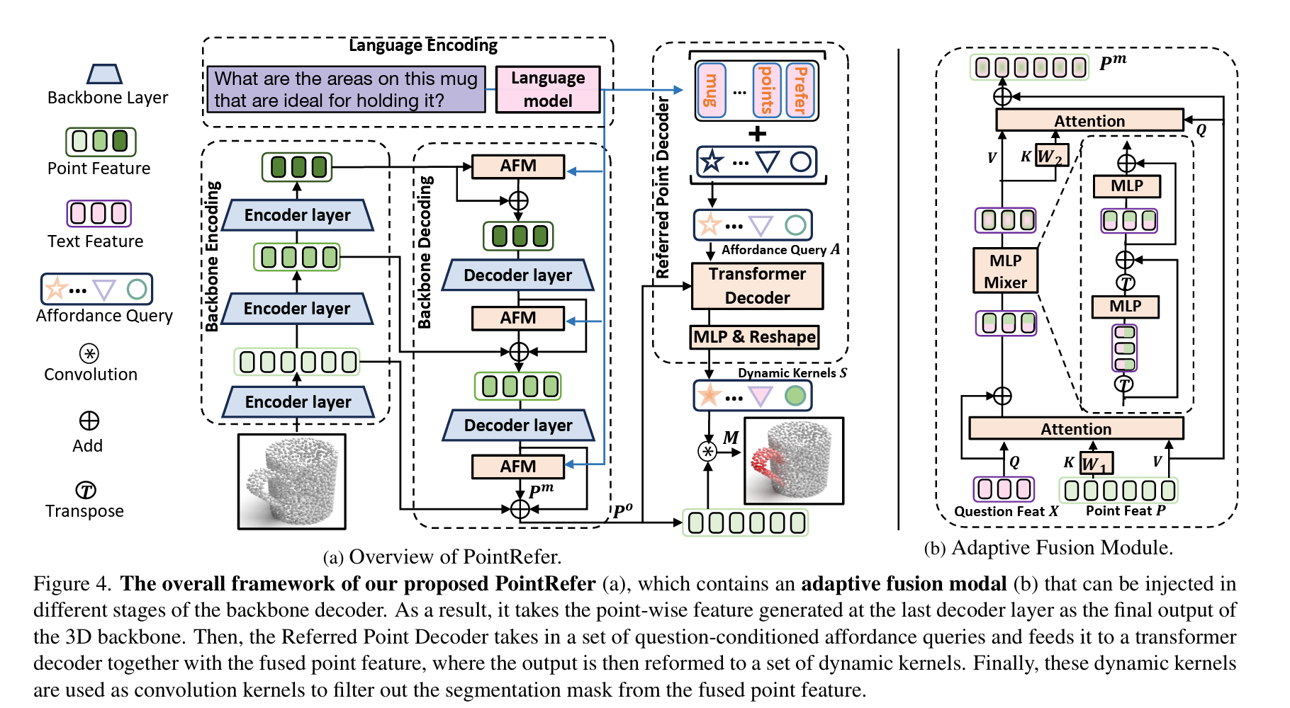PointRefer : The Adaptive Fusion Module is responsible for injecting semantic information at multiple scales. The Referred Point Decoder will introduce a set of affordance queries to interact with the point cloud features and complete the generation of dynamic convolution kernels.