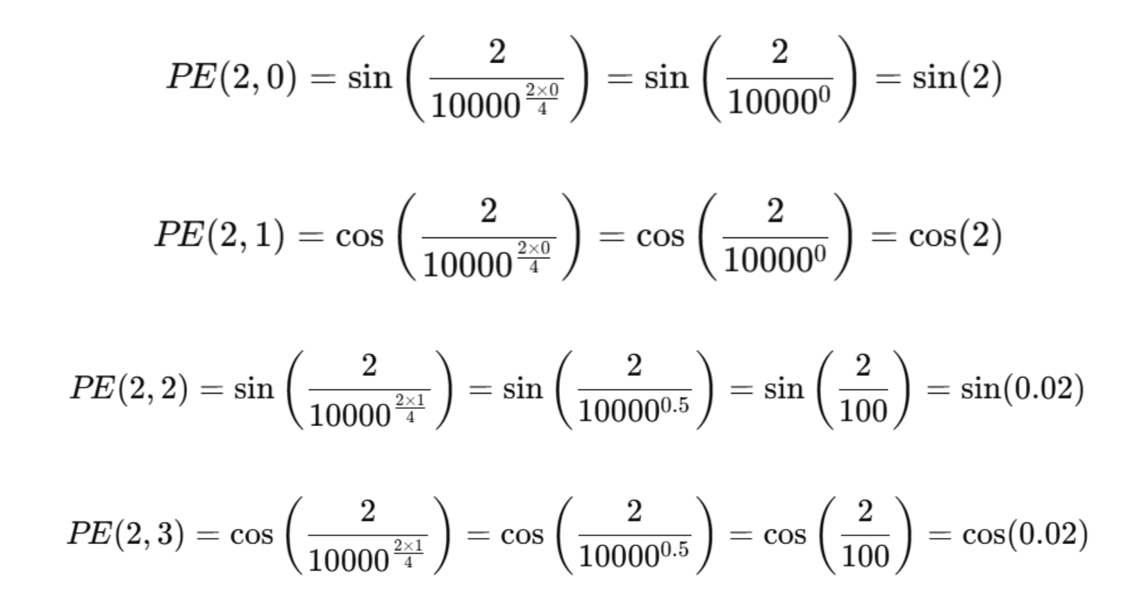 假设:我们要计算输入序列第 2 个位置 Token 对应的位置编码,编码的维度设定为 4 ,则: