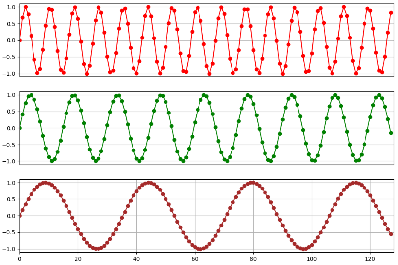 这三张图分别打印了 128 个位置向量第 2、6、12 维度的编码值的变化,我们发现这些值呈现周期性的变化。另外,我们也可以发现,向量维度越高,其周期就越长。