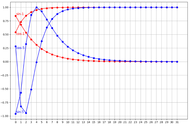 上图,我们打印了位置 1、5 的编码向量中的 sin 和 cos 计算得到的编码值。我们可以发现,基于正弦和余弦函数得到的位置编码可以保证唯一性。另外,也可以看到,向量的维度越高,编码值的波动就越小,向量就越接近。