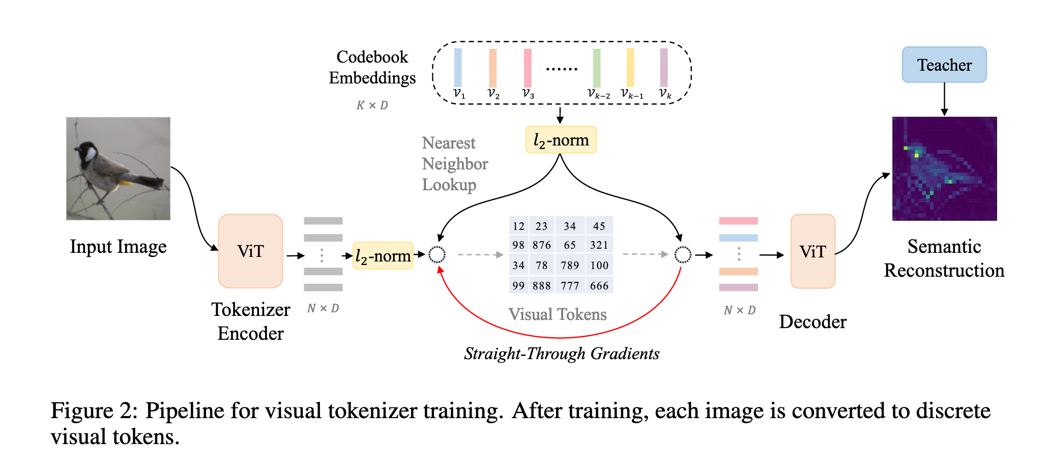 本文提出 向量量化知识蒸馏(VQ-KD),用于训练视觉 tokenizer 以支持 Vision Transformer 预训练。