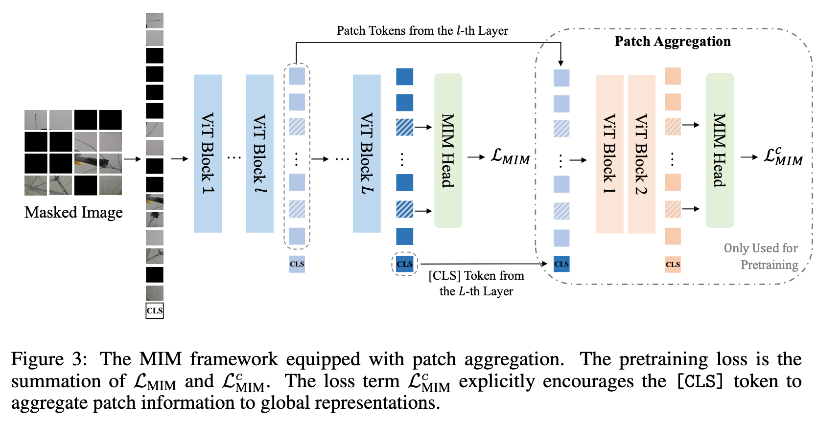 patch 聚合策略个人理解: 通过 CLS token 聚合全局信息并参与浅层 patch token 的遮挡预测,实现全局信息对局部特征学习的反哺,从而提升 MIM 任务的预训练效果。