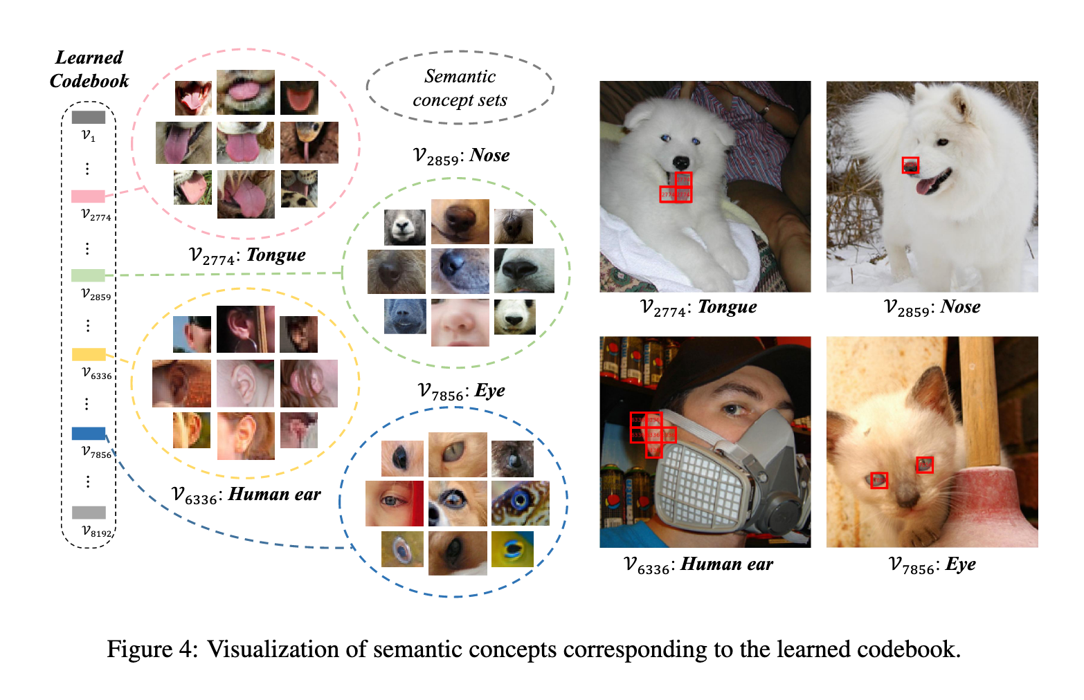 同一码本向量对应的图像 patch 语义一致,例如代码 7856 对应“眼睛”相关 patch