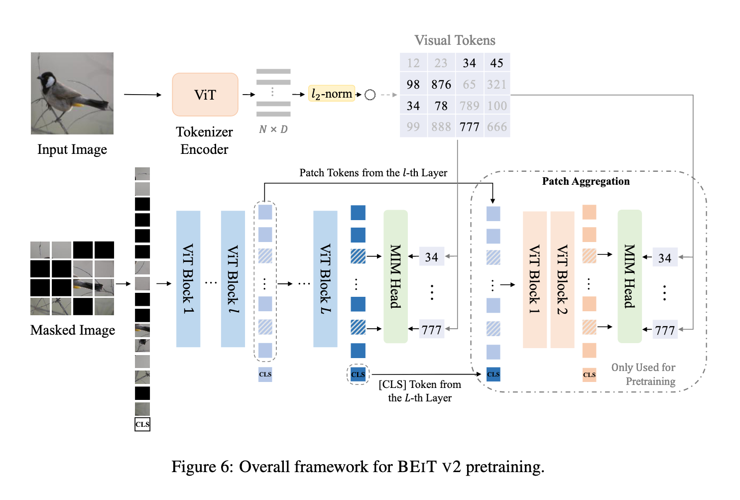 训练完成后,VQ-KD 的编码器被用作 BEIT V2 的语义视觉分词器,离散 token 作为监督信号进行 MIM 预训练。引入 图像块聚合策略,让 [CLS] token 聚合全局信息,解决传统 MIM 过度关注局部块重建而忽略全局表示的问题。