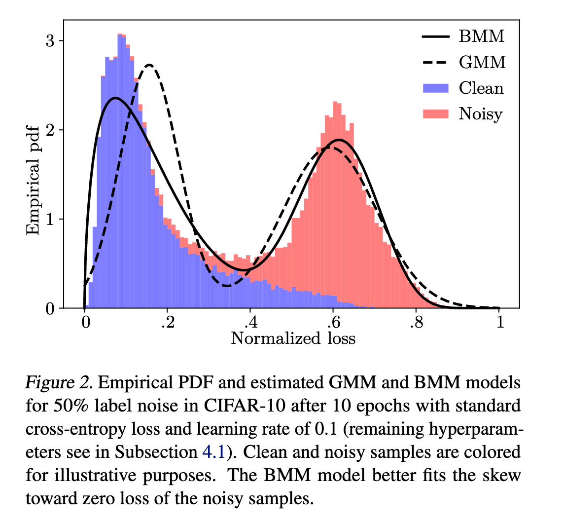 通过对 样本损失分布 进行建模,提出 双成分 Beta 混合模型 (BMM),分别对应“干净样本”和“噪声样本”。