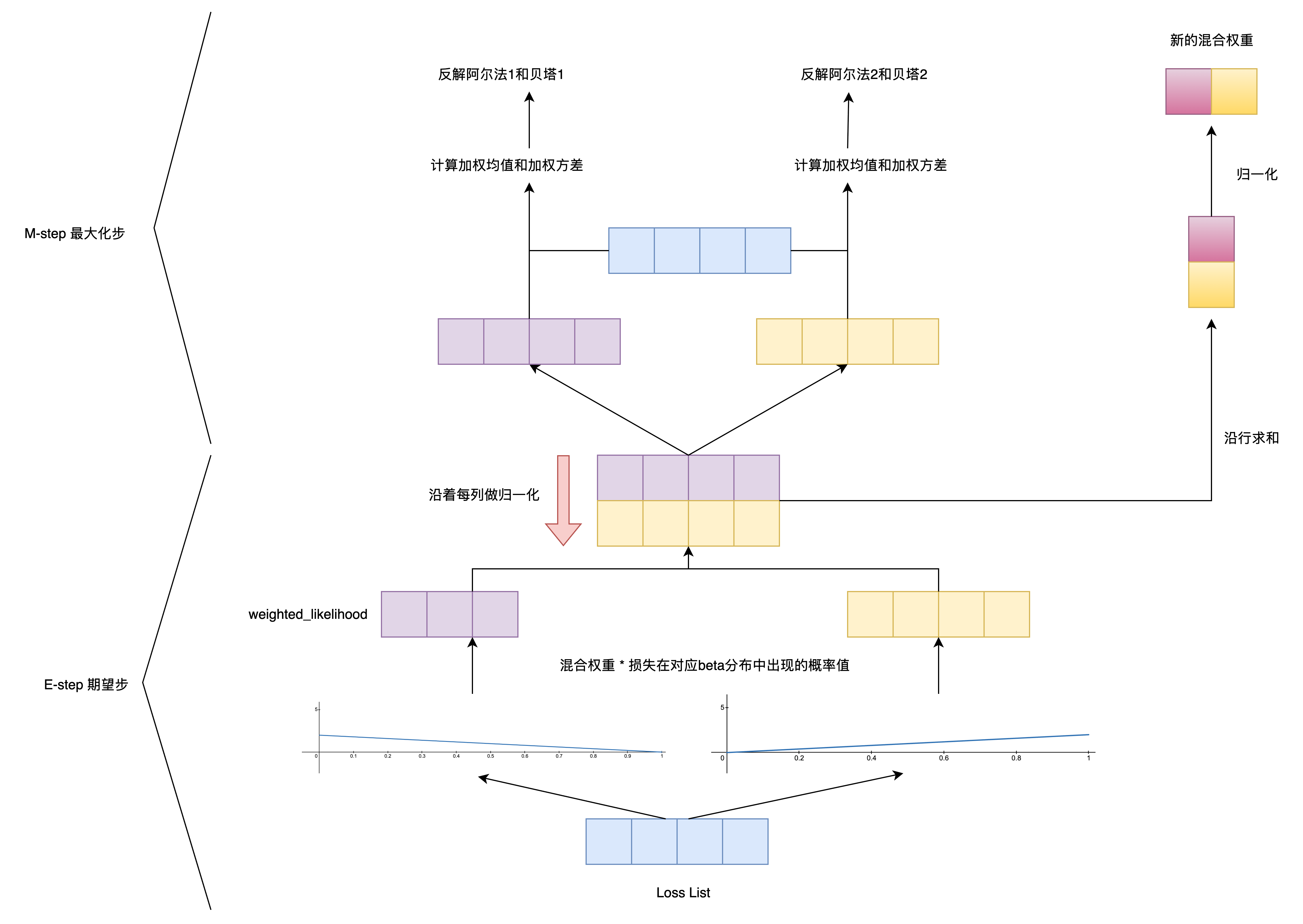 ,即样本损失来自分量 的概率。M 步(公式(5)(6)(7)):根据加权矩方法更新