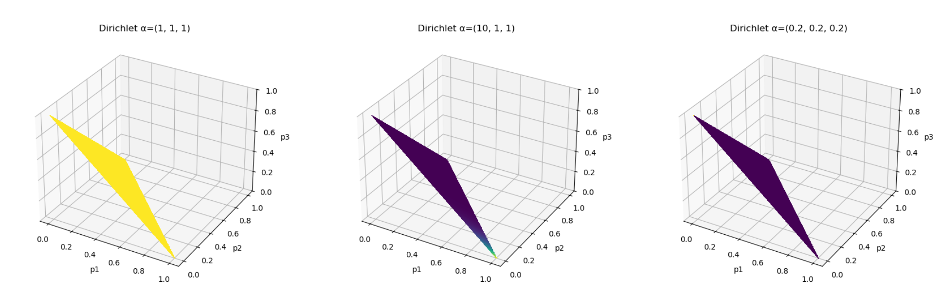 如果我们绘制 Dirichlet 分布的图,就可以看到不同的